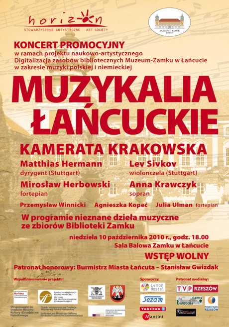 Stowarzyszenie Artystyczne Horizon oraz Dyrekcja Muzeum Zamku w Łańcucie zapraszają na uroczysty koncert, który odbędzie się 10 października 2010 r. o godz. 18.00 w Sali Balowej łańcuckiego zamku. Koncert jest organizowany w ramach promocji projektu Muzykalia łańcuckie, obejmującego digitalizację zasobów bibliotecznych Muzeum w zakresie muzyki polskiej i niemieckiej. Patronat honorowy – Burmistrz Miasta Łańcuta Pan Stanisław Gwizdak. W programie nieznane i zapomniane dzieła muzyczne ze zbiorów Biblioteki Zamku. Wykonawcy: soliści polscy i niemieccy, Kamerata Krakowska, dyrygent Matthias Hermann. WSTĘP WOLNY.